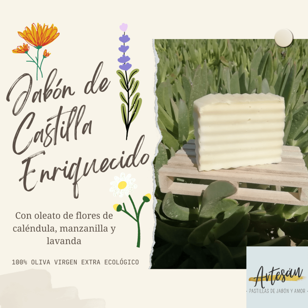 Este jabón ha sido enriquecido con un oleato de flores 💐 de caléndula, manzanilla y lavanda de elaboración propia, también en este aceite de oliva.